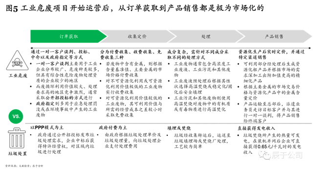 值得注意的是,工業(yè)危廢運(yùn)營(yíng)階段的競(jìng)爭(zhēng)同樣十分激烈,從來(lái)料獲取到產(chǎn)品銷售都極為市場(chǎng)化(見圖5)。以訂單獲取為例,工業(yè)危廢往往需要通過(guò)一對(duì)一客戶談判、投標(biāo)、中介以及政府指定等方式來(lái)展開,這與傳統(tǒng)的垃圾處置行業(yè)以PPP模式為主是截然不同的。
