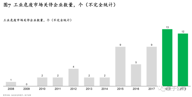 一是與市場(chǎng)需求種類不匹配,根據(jù)2019年最新修訂發(fā)布的《國(guó)家危險(xiǎn)廢物名錄》,我國(guó)危險(xiǎn)廢物分類共有46大類,471種,而我國(guó)90%以上危廢處置企業(yè)僅能處置5種或以下的危廢種類,供需種類錯(cuò)配的現(xiàn)象較嚴(yán)重;二是產(chǎn)能落后,處置規(guī)模小,技術(shù)和使用設(shè)備落后,無(wú)法滿足污染防治的要求;三是安全隱患突出,環(huán)境管理水平低下以及相關(guān)危險(xiǎn)廢物經(jīng)營(yíng)安全的規(guī)章制度不完善,導(dǎo)致環(huán)境安全隱患問(wèn)題突出??梢灶A(yù)見的是,隨著市場(chǎng)競(jìng)爭(zhēng)日益激烈,“小而弱”的工業(yè)危廢企業(yè)將越來(lái)越難以適應(yīng)市場(chǎng)新要求,頻頻被“出清”。據(jù)不完全統(tǒng)計(jì),2010-2014年,每年關(guān)停的工業(yè)危廢服務(wù)企業(yè)僅為2——4家,2018和2019年則分別達(dá)到了13和12家(見圖7)。