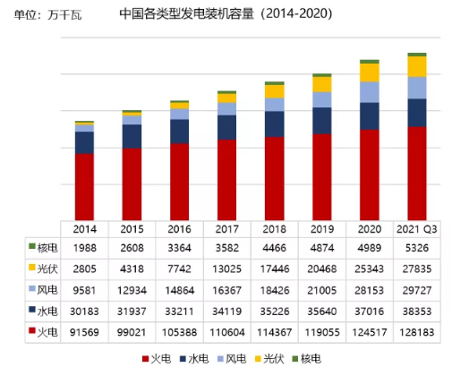 新能源的發(fā)展是《方案》中著力描寫的重要篇章。對于風電與太陽能發(fā)電,所采取的原則是“全面推進”;對于水電,開發(fā)的原則是“因地制宜”;對于核電,需要“積極安全有序發(fā)展”。此外,生物質(zhì)發(fā)電、地熱能以及波浪能、潮流能、溫差能等新能源的開發(fā)利用也有所提及,也將成為我國近十年內(nèi)探索發(fā)展的重要領(lǐng)域。國家能源局最新數(shù)據(jù)顯示,截至2021年第3季度末,我國風電和太陽能發(fā)電合計裝機容量合計5.8億千瓦,距離《方案》中要求的到2030年風光發(fā)電總裝機容量達到12億千瓦以上還有超過一倍的差距。未來十年,風光發(fā)電的裝機容量需要達到每年近8.5%的增長,水電需要在十四五和十五五期間分別新增4000萬千瓦裝機,對應現(xiàn)有水電裝機容量合計共增長近20%,才能滿足我國碳達峰行動方案的目標要求。