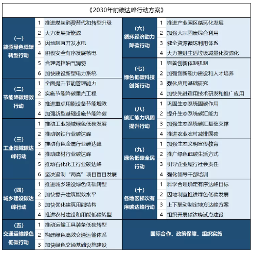 《2030年前碳達峰行動方案》作為我國對于碳達峰行動方案的總體規(guī)劃,提出了“碳達峰十大行動”,包含了43條具體工作內(nèi)容,對經(jīng)濟社會發(fā)展的各個領(lǐng)域構(gòu)建了全面、細致且量化的行動方案和工作目標,對于十四五和十五五時期重點領(lǐng)域的細分政策出臺形成了重要的指引。行動方案的主要內(nèi)容如下表所示,包括上述的“碳達峰十大行動”以及國際合作、政策保障、組織實施三方面的保障措施。