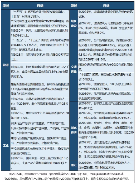 由于《方案》中的十條行動內(nèi)容覆蓋我國碳達峰實現(xiàn)路徑上的方方面面,本文對《方案》中提到的約束性目標做出了簡要歸納,絕大多數(shù)目標均設(shè)定了量化的指標,對未來十年的關(guān)鍵領(lǐng)域發(fā)展具有極強的指引作用。具體內(nèi)容如下表所示。