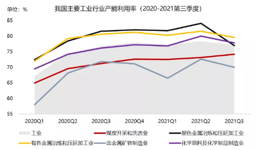 對于工業(yè)領(lǐng)域的碳達峰行動,除了在節(jié)能降碳增效環(huán)節(jié)提到的推動鋼鐵、有色金屬、建材、石化化工等行業(yè)開展節(jié)能降碳改造之外,《方案》對于重點行業(yè)的碳達峰行動還進行了詳細規(guī)劃。整體的思路為優(yōu)化產(chǎn)業(yè)結(jié)構(gòu),加快退出落后產(chǎn)能。其中鋼鐵行業(yè)是“嚴格執(zhí)行產(chǎn)能置換,嚴禁新增產(chǎn)能,推進存量優(yōu)化,淘汰落后產(chǎn)能”,有色金屬行業(yè)是“嚴格執(zhí)行產(chǎn)能置換,嚴控新增產(chǎn)能”,建材行業(yè)是“加強產(chǎn)能置換監(jiān)管,加快低效產(chǎn)能退出,嚴禁新增水泥熟料、平板玻璃產(chǎn)能”,石化化工行業(yè)是“優(yōu)化產(chǎn)能規(guī)模和布局,加大落后產(chǎn)能淘汰力度,嚴格項目準入”,體現(xiàn)了不同領(lǐng)域側(cè)重略有不同,但均為嚴格準入、控制產(chǎn)能的行動方案。從我國目前主要工業(yè)的產(chǎn)能利用率情況來看,《方案》所提及的相關(guān)行業(yè)的產(chǎn)能利用率在2020年來均處于85%以下的水平,最近2021年第三季度基本處于70%-80%區(qū)間,呈現(xiàn)中輕度的產(chǎn)能過剩的現(xiàn)象。由于工業(yè)是產(chǎn)生碳排放的主要領(lǐng)域之一,淘汰落后過剩產(chǎn)能,實現(xiàn)工業(yè)產(chǎn)能的轉(zhuǎn)型優(yōu)化,將是助力我國碳達峰的重要工作之一。