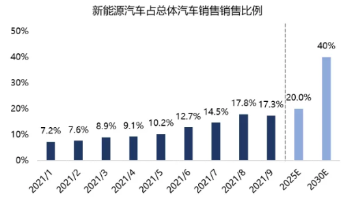 交通運輸領(lǐng)域則是要加快形成綠色低碳的運輸方式,主要行動集中于運輸工具裝備的低碳轉(zhuǎn)型、綠色化交運體系的構(gòu)建以及綠色交通基礎(chǔ)設(shè)施的建設(shè)三個方面。對于運輸工具裝備的低碳轉(zhuǎn)型,我們看到《方案》明確提出了積極擴大電力、氫能、天然氣、先進生物液體燃料等新能源和清潔能源在交通運輸領(lǐng)域的應用,并對到2030年當年新增新能源、清潔能源動力的交通工具比例提出了達到40%左右的要求。根據(jù)汽車工業(yè)協(xié)會的統(tǒng)計數(shù)據(jù),2021年前9個月,各月新能源汽車銷售占總體比例呈現(xiàn)顯著的增長趨勢,到2021年8月,該比例已增長至超過17%,接近《新能源汽車產(chǎn)業(yè)發(fā)展規(guī)劃(2021—2035年)》中對2025年設(shè)置的20%的目標。未來十年內(nèi),按照《方案》的規(guī)劃,到2030年該比例還要增長一倍至40%左右。然而按照當前的趨勢來看,新能源車的加速發(fā)展可能比預期更快,可以期待到2030年,得益于新能源汽車的蓬勃發(fā)展,加之其他陸路交通工具的能效提升,帶動陸路交通運輸石油消費在2030年前達到峰值。