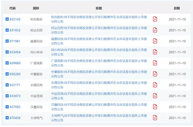11月10日晚間,10家新三板精選層企業(yè)披露《向不特定合格投資者公開發(fā)行股票并在北京證券交易所上市提示性公告》,均表示經(jīng)北交所同意,公司股票將于11月15日在北交所上市。