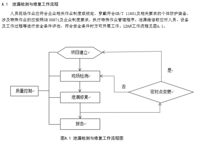 LDAR工作流程包括項目建立(資料收集、密封點識別、密封點檔案建立)、現(xiàn)場檢測和泄漏修復(fù)等 步驟。若企業(yè)因開停工、檢維修以及改擴(kuò)建等原因發(fā)生密封點變更的,需重新建立密封點檔案后開展現(xiàn) 場檢測和泄漏修復(fù)工作。LDAR工作流程按照附錄A進(jìn)行。