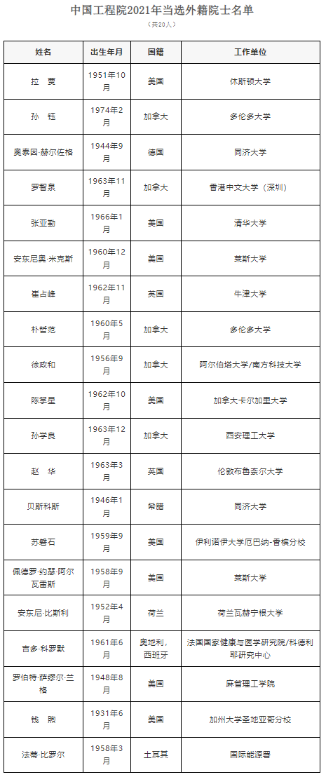 根據(jù)《中國(guó)科學(xué)院院士章程》《中國(guó)科學(xué)院院士增選工作實(shí)施細(xì)則》《中國(guó)科學(xué)院外籍院士選舉辦法》等規(guī)定,2021年中國(guó)科學(xué)院選舉產(chǎn)生了65名中國(guó)科學(xué)院院士和25名中國(guó)科學(xué)院外籍院士。現(xiàn)予公布。