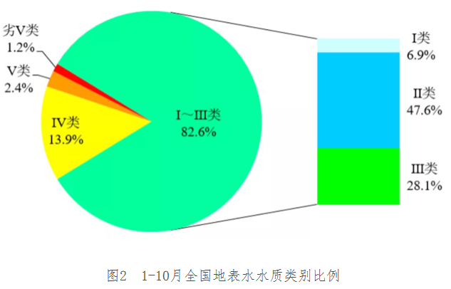 1-10月,3641個國家地表水考核斷面中,水質(zhì)優(yōu)良(Ⅰ~Ⅲ類)斷面比例為82.6%,同比上升1.2個百分點;劣Ⅴ類斷面比例為1.2%,同比下降0.8個百分點。主要污染指標為化學需氧量、高錳酸鹽指數(shù)和總磷。