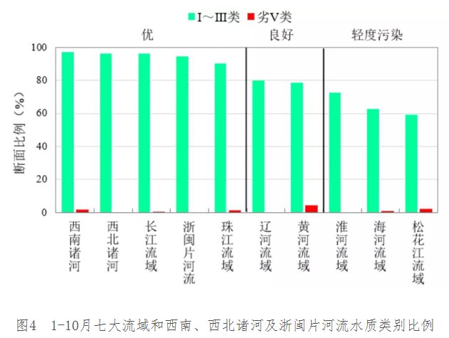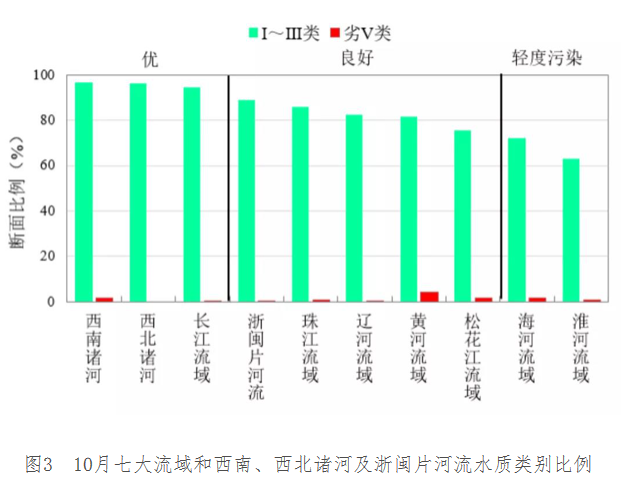 10月,長江、黃河、珠江、松花江、淮河、海河、遼河等七大流域及西北諸河、西南諸河和浙閩片河流水質(zhì)優(yōu)良(Ⅰ~Ⅲ類)斷面比例為84.8%,同比下降0.5個百分點;劣Ⅴ類斷面比例為1.0%,同比下降0.3個百分點。主要污染指標為高錳酸鹽指數(shù)、總磷和化學需氧量。其中,西南和西北諸河、長江流域水質(zhì)為優(yōu);浙閩片河流、珠江、遼河、黃河和松花江流域水質(zhì)良好;淮河和海河流域為輕度污染。