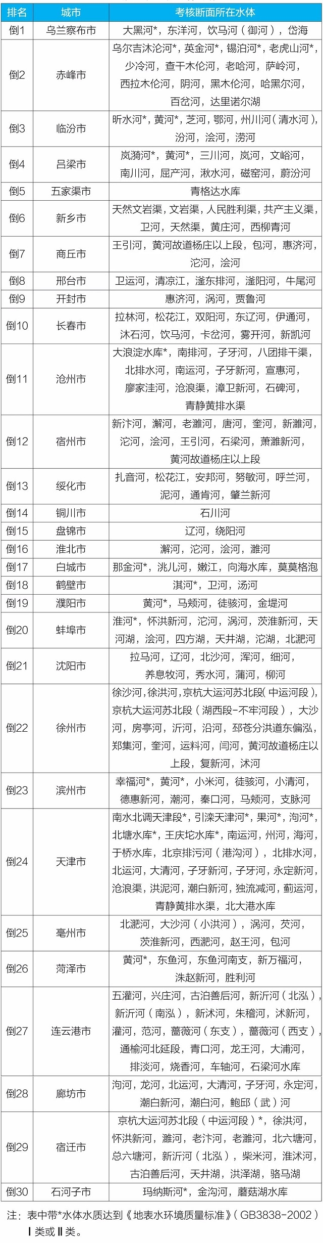 地級及以上城市國家地表水考核斷面排名