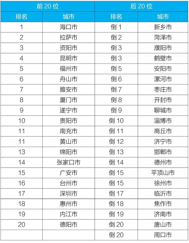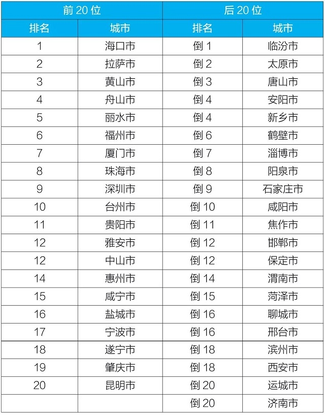 10月,168個重點城市中,???、拉薩和資陽市等20個城市空氣質(zhì)量相對較好(從第1名至第20名),新鄉(xiāng)、菏澤和濮陽市等20個城市空氣質(zhì)量相對較差(從倒數(shù)第1名至并列倒數(shù)第20名),見附表3。