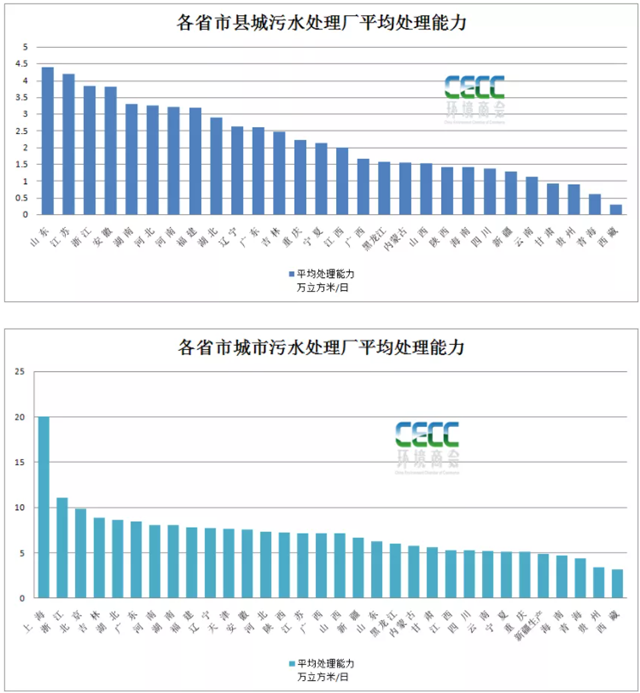 上一篇中提到的城市污水廠平均污水處理能力來看,除開上海的平均污水處理能力達(dá)20萬噸/日外,浙江省城市污水廠平均處理能力達(dá)11萬噸/日,吉林、湖北、廣東、河南、湖南等省市城市污水廠平均處理能力排在靠前的位置,大約在8萬噸/日??梢钥吹?,浙江省在城市和縣城的污水廠平均處理能力都排在前列,可見污水廠單體規(guī)模相對較大。山東、江蘇、安徽縣城污水處理廠平均處理能力較大,而城市污水處理廠則處在全國的中等水平。