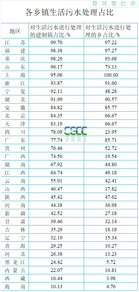 分省市來看,江蘇、福建、重慶、上海、浙江、湖北等6個省市90%以上鄉(xiāng)鎮(zhèn)生活污水實(shí)現(xiàn)處理,其他省市有不同程度缺口,具體如下: