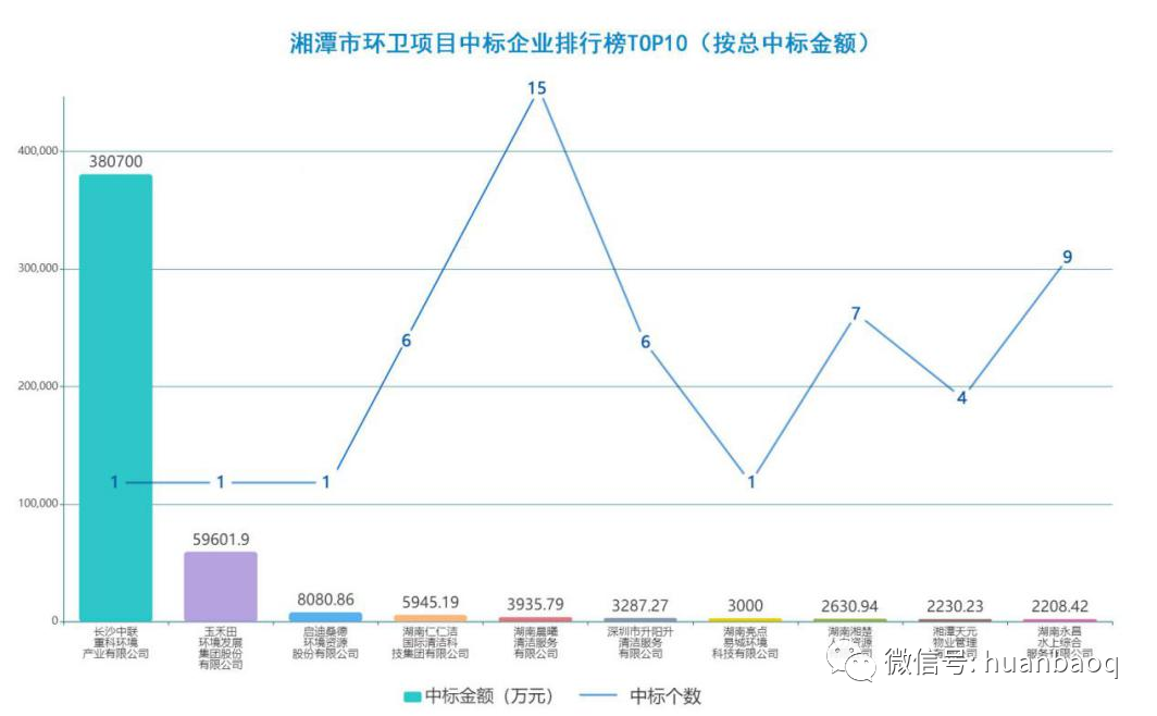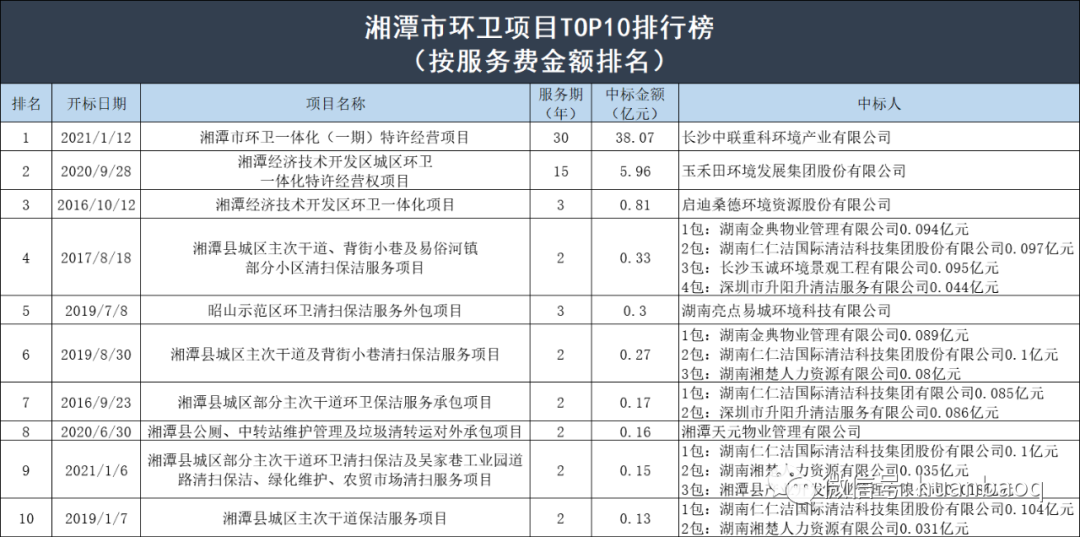 不過,換個角度,如果從中標金額看,盈峰中聯(lián)則是最大的勝利者,雖然只中標一個項目,但是服務(wù)費高達38.07億元,位列第一;第二和第三分別為玉禾田和啟迪桑德環(huán)境,中標金額分別為59601.9萬元和8080.86萬元,其實這兩家公司也僅僅中標了一個項目。? 首先值得注意的是本地“巨鱷”——長沙中聯(lián)重科環(huán)境產(chǎn)業(yè)有限公司。剛剛過去的8月21日,盈峰中聯(lián)發(fā)布了2021年半年度報告,營收54.48億元,歸母凈利潤3.71億元。報告期內(nèi),公司環(huán)衛(wèi)服務(wù)營業(yè)收入實現(xiàn)13.53億元,同比增長68.64%,成功突破廣州、蘇州、武漢、中山、三亞等15個地級市首次落地環(huán)衛(wèi)服務(wù)項目,市場開拓能力顯著。在湖南本地環(huán)衛(wèi)市場上,該公司今年也斬獲了多個億級項目:·2021年1月12日,中標湘潭市環(huán)衛(wèi)一體化(一期)特許經(jīng)營項目,項目特許經(jīng)營期限30年,總服務(wù)費約為38.07億元;·2021年5月31日,中標邵陽市新寧縣城鄉(xiāng)環(huán)衛(wèi)一體化項目特許經(jīng)營項目,合計投標總價4.81億元,服務(wù)期15年(含建設(shè)期1年);·2021年7月19日,中標湘西土家族苗族自治州鳳凰縣城鄉(xiāng)生活垃圾收轉(zhuǎn)運一體化服務(wù)采購項目,服務(wù)期限8年,總服務(wù)金額約為2.14億;中標價231元/噸,項目日轉(zhuǎn)運規(guī)模317.62噸(保底量設(shè)定為300噸/天,超出部分據(jù)實結(jié)算)。鑒于盈峰中聯(lián)在行業(yè)內(nèi)的強悍實力和湖南本土企業(yè)的地區(qū)優(yōu)勢,筆者預(yù)測未來很長時間內(nèi),他將持續(xù)稱霸湘潭市環(huán)衛(wèi)市場。根據(jù)2021年上半年年報,玉禾田營業(yè)收入約23.98億元,同比增長16.61%。此項數(shù)據(jù)已經(jīng)超過了該企業(yè)去年全年營收的一半。在湖南省環(huán)衛(wèi)市場上,玉禾田也有一定的收獲,中標的湘潭市項目是該地區(qū)唯二的億級環(huán)衛(wèi)項目:·2020年9月28日,中標湘潭經(jīng)濟技術(shù)開發(fā)區(qū)城區(qū)環(huán)衛(wèi)一體化特許經(jīng)營權(quán)項目,服務(wù)期15年,服務(wù)費5.96億元。·2021年4月21日,中標株洲市蘆淞區(qū)環(huán)衛(wèi)服務(wù)項目,中標金額為1.35億元,服務(wù)期3年。本項目分為9個包組,玉禾田中標包2,服務(wù)費3217.33萬元。作為一個外地企業(yè),玉禾田已經(jīng)在湖南省內(nèi)成功打開了局面,期待他有更好的表現(xiàn)。? 排名第三的是啟迪桑德環(huán)境資源股份有限公司。對湘潭市環(huán)衛(wèi)市場而言,啟迪環(huán)境入局時間很早。2016年10月12日,啟迪桑德環(huán)境中標湘潭經(jīng)濟技術(shù)開發(fā)區(qū)環(huán)衛(wèi)一體化項目,但此后,就再也未能見到該企業(yè)中標湘潭市環(huán)衛(wèi)項目的信息。近年來,啟迪環(huán)境常被負面信息纏身。根據(jù)啟迪環(huán)境2021年上半年業(yè)績預(yù)告,預(yù)計2021年上半年虧損33億元至40億元,相較于上年同期的盈利1.81億元,同比大降1927%—2315%。對啟迪環(huán)境來說,解決財務(wù)問題的最大的轉(zhuǎn)機或許是1月11日城發(fā)環(huán)境發(fā)布的擬換股吸收合并事件。啟迪環(huán)境是否能通過和城發(fā)“聯(lián)姻”緩解資金鏈危機?此次行業(yè)矚目的合作是否能有“實錘”?我們將拭目以待。此外,榜單中的湖南仁仁潔國際清潔科技集團有限公司、湖南晨曦清潔服務(wù)有限公司、湖南亮點易城環(huán)境科技有限公司均為湖南本地環(huán)衛(wèi)企業(yè)。湖南湘楚人力資源有限公司、湘潭天元物業(yè)管理有限公司都屬于非環(huán)衛(wèi)企業(yè),湖南永昌水上綜合服務(wù)有限公司則屬于水上運輸服務(wù)業(yè)。另外一點值得注意的是,目前榜首的10家企業(yè)均為私企,顯示地方國企在湘潭市環(huán)衛(wèi)市場上明顯發(fā)力不足。