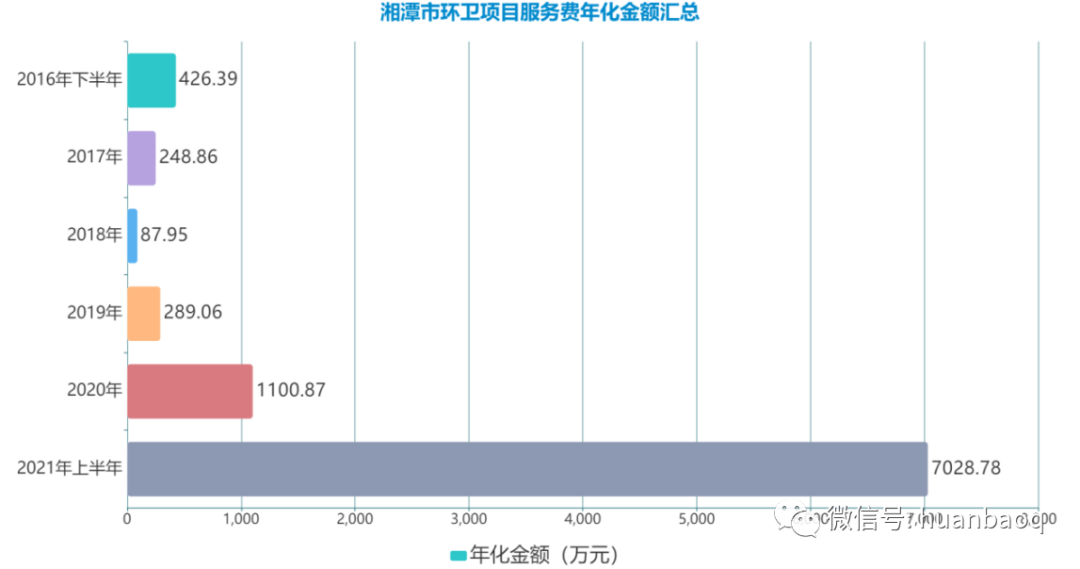 5年發(fā)布118個環(huán)衛(wèi)項目,2020年成轉(zhuǎn)折點據(jù)統(tǒng)計,2016年7月1日至2021年6月30日,湘潭市共發(fā)布118個環(huán)衛(wèi)項目,服務(wù)費金額合計約為48.34億元。▼118個環(huán)衛(wèi)項目中,TOP10項目的排行榜如下(按服務(wù)費金額):