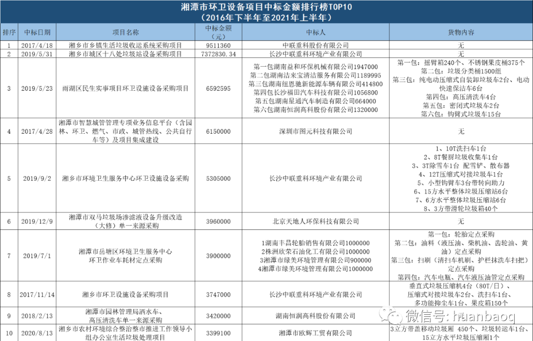 從上圖可以明顯看出,湘潭市2019年共發(fā)布38個環(huán)衛(wèi)裝備項目,總金額合計近6千萬,不論是項目個數(shù)還是總金額,都是2016年以來最高的一年。能查到中標金額的130個項目中,中標金額最高的是2017年4月18日開標的湘鄉(xiāng)市鄉(xiāng)鎮(zhèn)生活垃圾收運系統(tǒng)采購項目,中標金額951.14萬元,中標人為中聯(lián)重科股份有限公司,貨物內(nèi)容詳情并未公示。▼以下為湘潭市環(huán)衛(wèi)設(shè)備項目中標金額TOP10排行榜:
