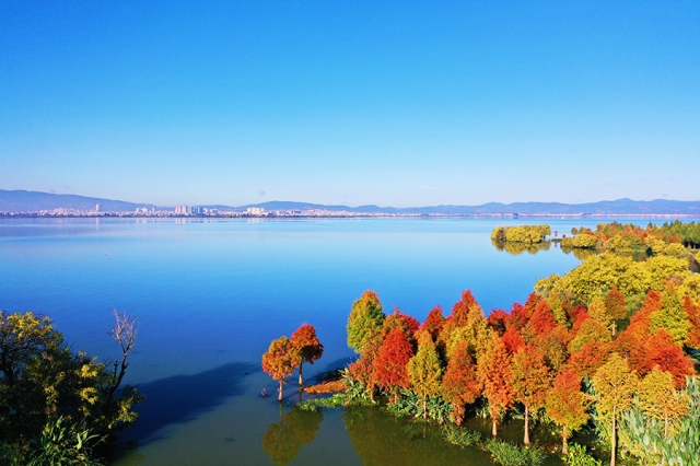 星云湖西岸的中山杉豐富了沿岸植物種群。(11月19日攝)。新華網(wǎng)發(fā)(江川區(qū)融媒體中心 供圖)