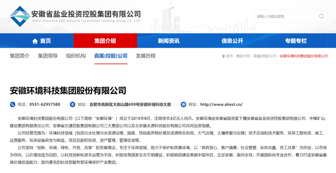 這一次,通過引入中鐵、中交兩家央企,一是可以導(dǎo)入央企的優(yōu)質(zhì)資源,二是可以引進央企的先進管理理念,為原有的安徽鹽業(yè)集團加持。因為是以鹽業(yè)集團為基礎(chǔ)組建的生態(tài)環(huán)境產(chǎn)業(yè)集團,所以這次組建也被不少網(wǎng)友戲稱為“我為環(huán)保帶鹽”、“有鹽在先”。為什么是以安徽鹽業(yè)集團為基礎(chǔ)進行組建?主要因為它有這方面的基礎(chǔ)。早在2015年,安徽鹽業(yè)集團就與碧水源等共同出資,組建了安徽環(huán)境科技集團股份有限公司(簡稱“安徽環(huán)境”),注冊資本3億元人民幣。▼安徽環(huán)境官網(wǎng)截圖