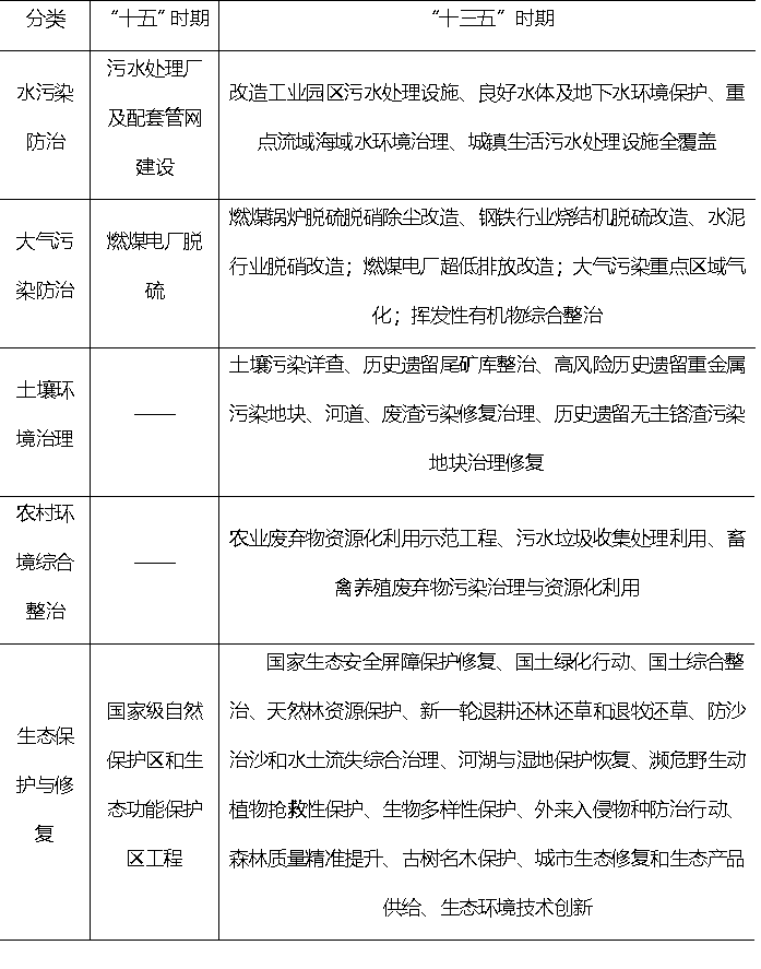 根據(jù)國務(wù)院《關(guān)于國家環(huán)境保護“十五”計劃的批復(fù)》(國函〔2001〕169號)和《關(guān)于印發(fā)“十三五”生態(tài)環(huán)境保護規(guī)劃的通知》(國發(fā)〔2016〕65 號),本文基于五大領(lǐng)域分別梳理兩個文件所列重點工程。從水污染防治、大氣污染防治、生態(tài)保護與修復(fù)三大領(lǐng)域看,“十三五”時期較“十五”時期工程任務(wù)更重,細分領(lǐng)域更多。從土壤環(huán)境治理和農(nóng)村環(huán)境綜合整治兩大領(lǐng)域看,“十五”時期尚未涉及,“十三五”時期該工程已具有較多建設(shè)內(nèi)容(表1)。類似“雙碳”目標(biāo)和新污染物,伴隨中國經(jīng)濟社會發(fā)展,待控污染物種類在增加,污染排放標(biāo)準(zhǔn)在提高,環(huán)保新領(lǐng)域不斷出現(xiàn),在很長時間內(nèi),環(huán)保重點工程細分領(lǐng)域?qū)⒊试黾于厔?,環(huán)保投資構(gòu)成將愈發(fā)豐富。