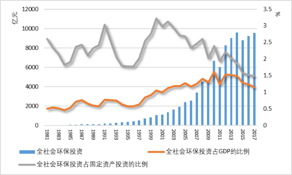 圖2 1981—2017年中國全社會環(huán)保投資及占GDP和固定資產(chǎn)投資的比例(注:2017年以后建設(shè)項目“三同時”環(huán)保投資無數(shù)據(jù),全社會環(huán)保投資規(guī)模無法獲取)