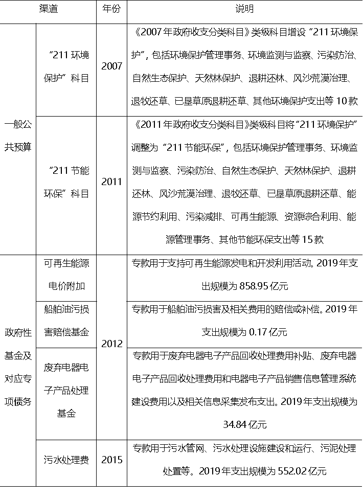 1979年制定的環(huán)保“三同時”制度能夠保障新改擴建項目環(huán)保投資,是排污企業(yè)落實污染者付費責(zé)任的重要渠道。財政環(huán)保支出渠道拓展主要體現(xiàn)在兩大渠道:第一個渠道是一般公共預(yù)算,2007年新設(shè)“211環(huán)境保護”科目,2011年將其調(diào)整為“211節(jié)能環(huán)?!笨颇浚颇繂卧O(shè)表明政府對環(huán)境保護工作高度重視,相關(guān)支出會隨之增加。第二個渠道是政府性基金及對應(yīng)專項債務(wù),與環(huán)境保護直接相關(guān)的有四項。其中,可再生能源電價附加、船舶油污損害賠償基金以及廢棄電器電子產(chǎn)品處理基金于2012年納入政府性基金管理,污水處理費于2015年納入政府性基金管理(表2)。政府性基金??顚S茫瑸橄嚓P(guān)領(lǐng)域財政環(huán)保支出提供穩(wěn)定渠道。
