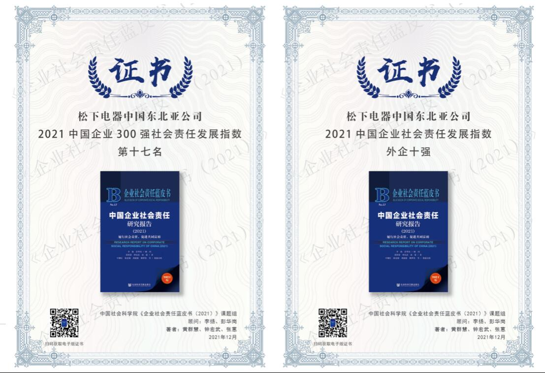 2021年12月3日,由中國社科院舉辦的“第十三屆《企業(yè)社會責任藍皮書》發(fā)布會”在京舉辦。在本次活動中,發(fā)布了最新的中國企業(yè)300強(國企、民企、外企)社會責任發(fā)展指數(shù)排名,松下電器取得了總排名第17位,外企第3名的優(yōu)異評價。