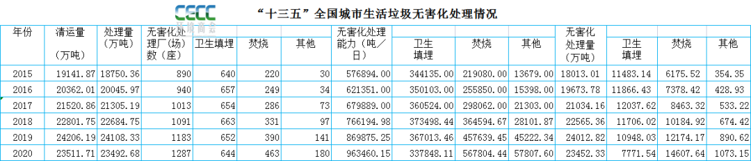 1. “十三五”全國城市環(huán)境衛(wèi)生水平截至2020年,我國城市生活垃圾清運(yùn)量達(dá)到23512萬噸,較“十二五”末新增22.7%,生活垃圾處理量23492.68萬噸,較“十二五”新增25.3%,其中無害化處理量23452.33萬噸,城市生活垃圾無害化處理率超99.8%,較“十二五”增長30.19%。無害化處理能力達(dá)到963460噸/日,其中衛(wèi)生填埋能力達(dá)到337848.11噸/日,垃圾焚燒處理能力達(dá)到567804.44噸/日。