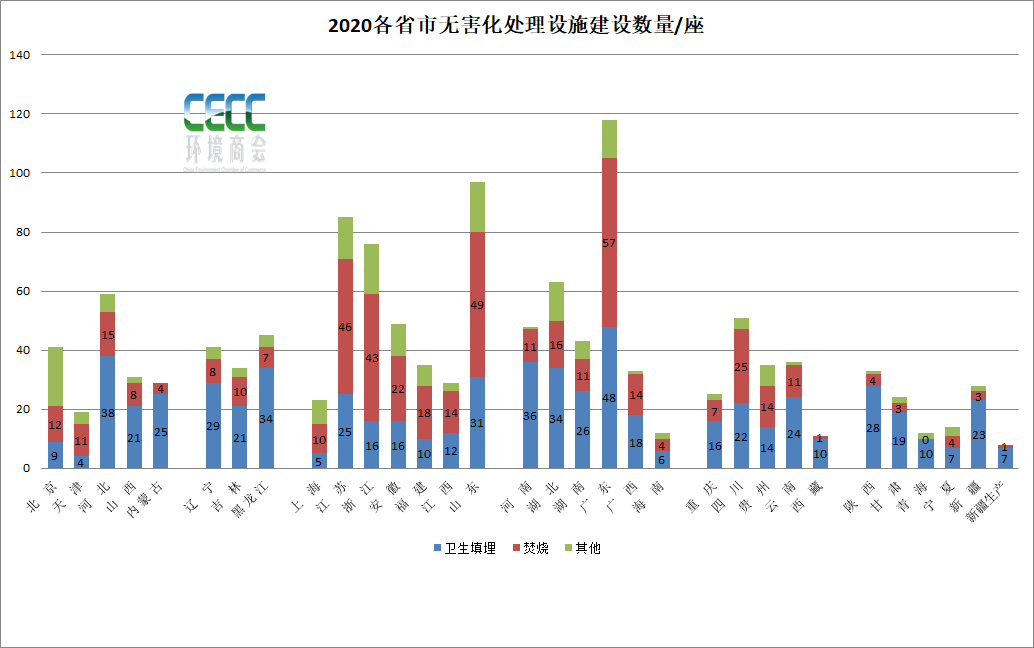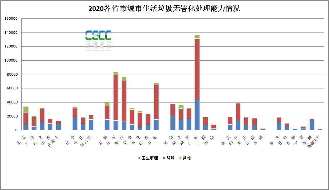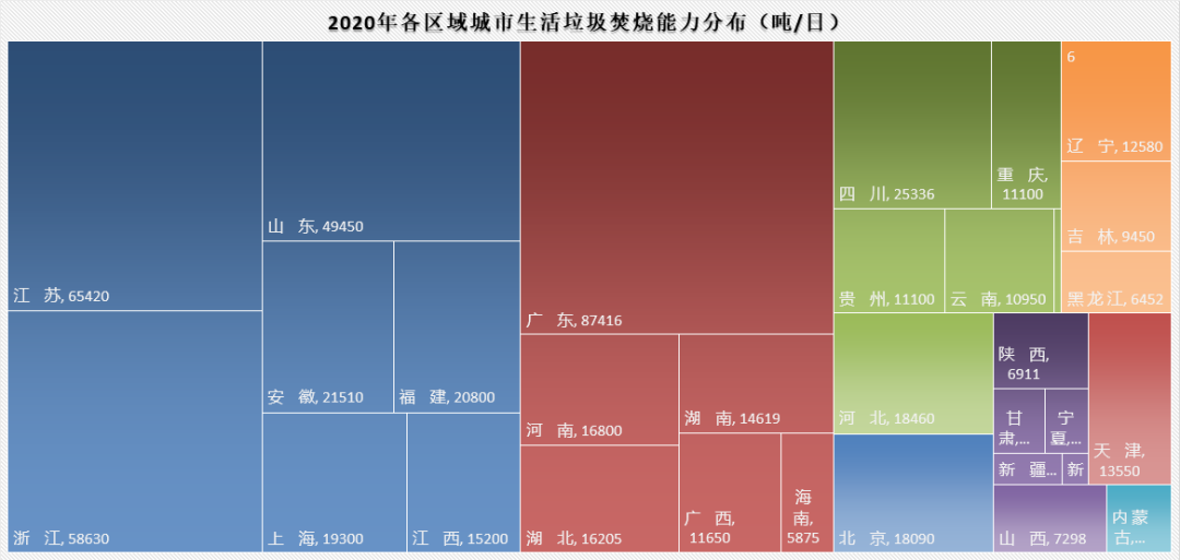 從無害化處理量上來看,截至2020年,在兩億多噸無害化處理總量中,垃圾焚燒處理生活垃圾14607.64萬噸,占處理總量的62%,衛(wèi)生填埋處理生活垃圾7771.54萬噸,占比約33%。其他無害處理方式處理生活垃圾1073萬噸,占比約4.6%。縱觀“十三五”這五年的數(shù)據(jù),衛(wèi)生填埋和垃圾焚燒這兩種生活垃圾處理的主要方式出現(xiàn)主次地位交替現(xiàn)象。分水嶺在2018年。2018年左右,填埋處理能力趨向頂峰,之后基本持平,略有降低,而城市垃圾焚燒處理能力“十三五”出現(xiàn)大幅提升,平均增速在21%。填埋和焚燒2018年經(jīng)歷持平之后垃圾焚燒能力超過填埋。如果從無害化處理量上來看,填埋處理總量在近兩年出現(xiàn)比較明顯的減少,2019年到2020年減少幅度在3175萬噸左右。截至2020年,廣東、山東、江蘇、浙江四個(gè)省無害處理設(shè)施建設(shè)數(shù)量領(lǐng)跑,分別為118座、97座、85座和76座,它們建設(shè)的垃圾焚燒處理設(shè)施也最多,分別擁有57座、49座、46座、43座。而衛(wèi)生填埋場相對較多的省市則是廣東?。?8座)、河北省(38座),河南?。?6座),湖北?。?4座)。按區(qū)域來看,華北地區(qū)、華中地區(qū)以及西南地區(qū)、東北地區(qū)建設(shè)垃圾填埋場數(shù)量明顯多于華東、華南地區(qū)。如果從無害化處理能力來看,又是另一番景象。廣東、山東、江蘇、浙江四省無害化處理能力仍然領(lǐng)跑,其中垃圾焚燒處理能力分別達(dá)到87416噸/日、49450噸/日、65420噸/日、58630噸/日??梢钥吹脚判蚵杂凶兓?,江蘇、浙江的垃圾焚燒處理能力高于山東省,推算如果論平均單體垃圾焚燒項(xiàng)目規(guī)模,江蘇和浙江省高于山東省。數(shù)據(jù)中還可以看到,這幾個(gè)省份是大力發(fā)展生活垃圾焚燒的省份,不僅焚燒廠建得多,而且垃圾焚燒日處理能力和處理量也處在突出高位。再看其他區(qū)域,實(shí)際上從日處理能力上來看,湖北、河北、四川等省市雖然垃圾焚燒廠不及垃圾填埋場多,但日處理能力比填埋高,仍是以垃圾焚燒處理為主,也可以看出這幾個(gè)地方單體垃圾焚燒處理廠的規(guī)模相對較大,而陜西、河南以及地廣人稀的東北地區(qū)等地仍以填埋為主要方式。