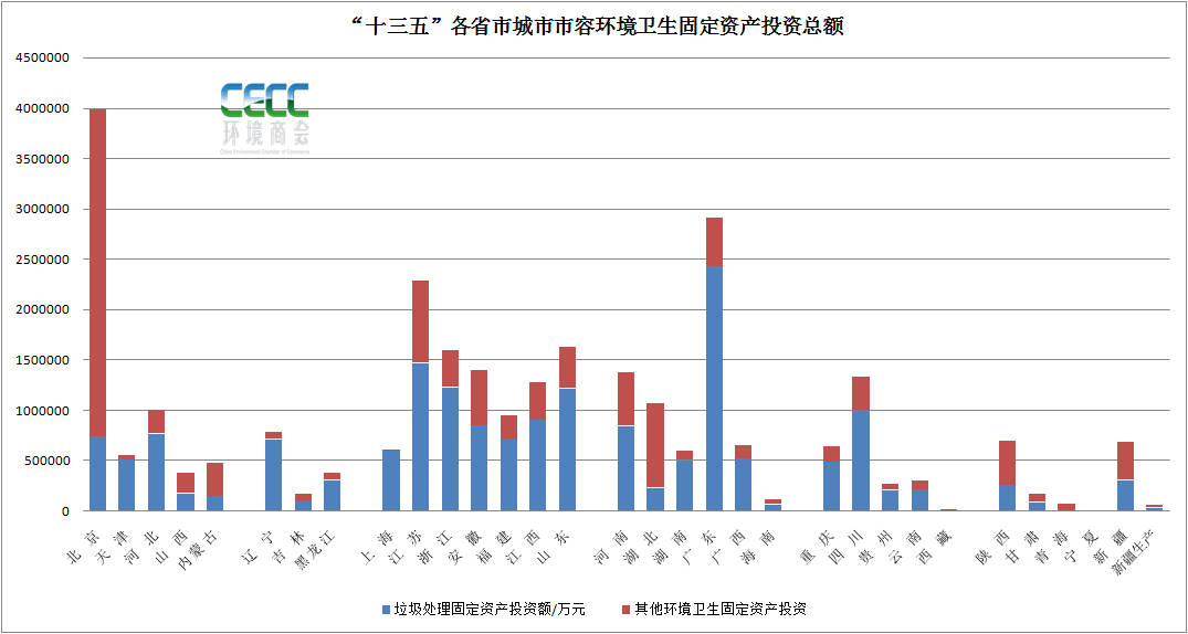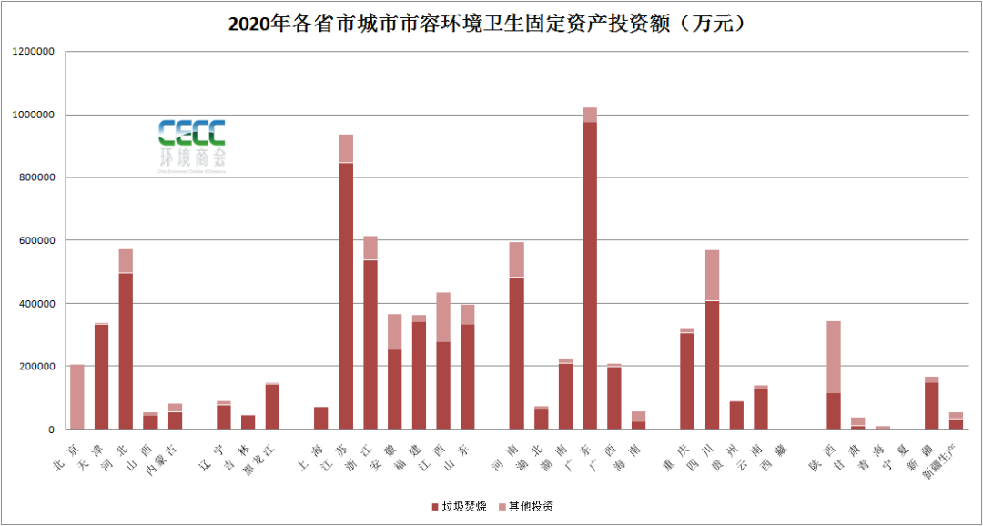 從區(qū)域來看,2020年,廣東(97.3億元)、江蘇(84.6億元)、浙江(53.7億元)以及河北(49.7億元)、河南(48.3億元)等地環(huán)境市容衛(wèi)生設(shè)施建設(shè)投入較大,其中大部分資金用于垃圾處理設(shè)施建設(shè)。整個(gè)“十三五”時(shí)期,北京、廣東、江蘇等地城市環(huán)境衛(wèi)生固定資產(chǎn)投資較大,其中北京五年的投資額接近400億,特別是2016年、2017年兩年,投資額均在百億以上。