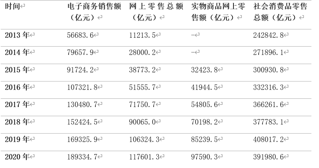 近年來我國互聯(lián)網(wǎng)產(chǎn)業(yè)呈現(xiàn)高速發(fā)展態(tài)勢,網(wǎng)民數(shù)量與互聯(lián)網(wǎng)普及率不斷增長,為網(wǎng)絡(luò)購物奠定了龐大的用戶基礎(chǔ)。數(shù)據(jù)顯示,截至2020年3月,我國網(wǎng)民規(guī)模達(dá)9.04億人,互聯(lián)網(wǎng)普及率為64.5%,較2018年底提升4.9個(gè)百分點(diǎn)。與此同時(shí),電子商務(wù)市場規(guī)模也在不斷增長。2020年,電商領(lǐng)域總就業(yè)人數(shù)達(dá)到6015萬,較2019年增長約17.35%,預(yù)計(jì)到2025年將達(dá)到7000萬人。此外,2021年上半年,我國電商用戶達(dá)8.12 億,較2020年12月增長2965萬。2020年網(wǎng)上零售額為11.76萬億元,是2013年的10.5倍,占社會消費(fèi)品零售額的比重由2013年的5%增長到2020年的30%。《2021年中國電商年度發(fā)展報(bào)告》顯示,今年前三季度我國網(wǎng)上零售額達(dá)9.19萬億元,同比增長18.5%。