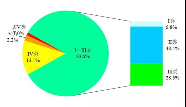 1-11月,3641個國家地表水考核斷面中,水質優(yōu)良(Ⅰ——Ⅲ類)斷面比例為83.6%,同比上升1.7個百分點;劣Ⅴ類斷面比例為1.0%,同比下降0.8個百分點。主要污染指標為化學需氧量、高錳酸鹽指數和總磷。