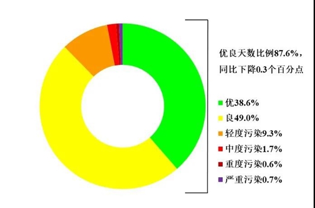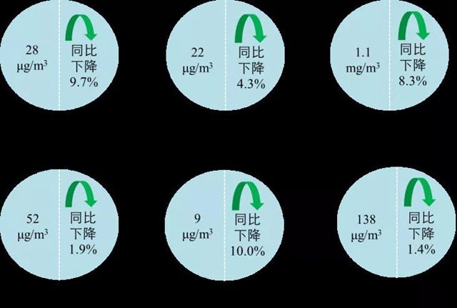 1-11月,全國339個地級及以上城市平均優(yōu)良天數比例為87.6%,同比下降0.3個百分點;PM2.5平均濃度為28微克/立方米,同比下降9.7%;PM10平均濃度為52微克/立方米,同比下降1.9%;O3平均濃度為138微克/立方米,同比下降1.4%;SO2平均濃度為9微克/立方米,同比下降10.0%;NO2平均濃度為22微克/立方米,同比下降4.3%;CO平均濃度為1.1毫克/立方米,同比下降8.3%。