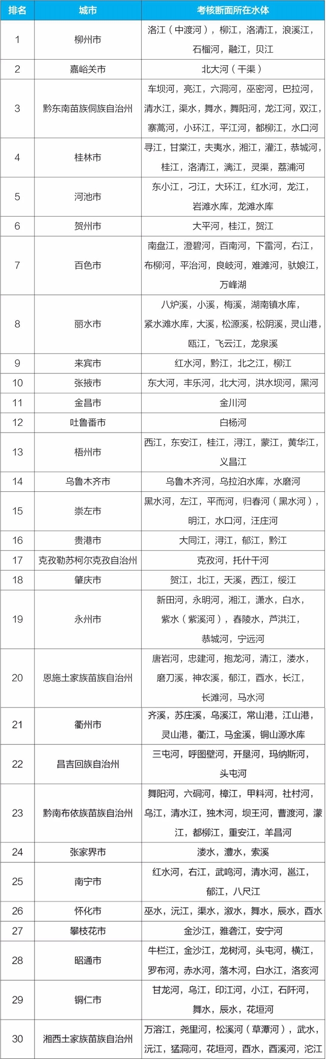 1-11月國家地表水考核斷面水環(huán)境質量狀況排名前30位城市及所在水體