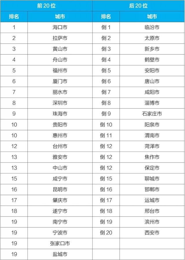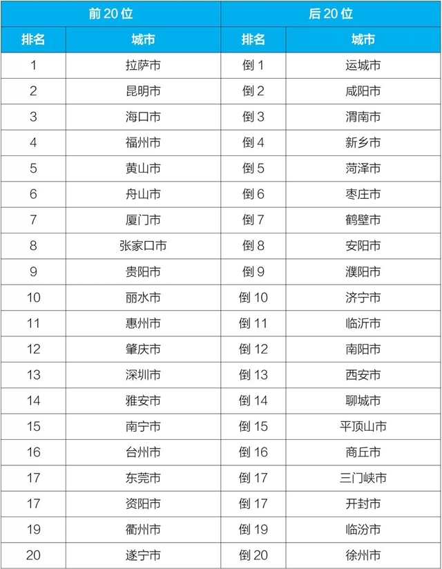 2021年11月168個重點城市空氣質量排名前20位和后20位城市名單