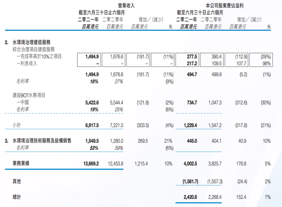 2021年上半年,北控水務(wù)實(shí)現(xiàn)營(yíng)收136.69億港元,同比增9.8%;公司實(shí)現(xiàn)收益40.32億元人民幣,同比增83%;股東應(yīng)占溢利24.21億港元,同比增7%;