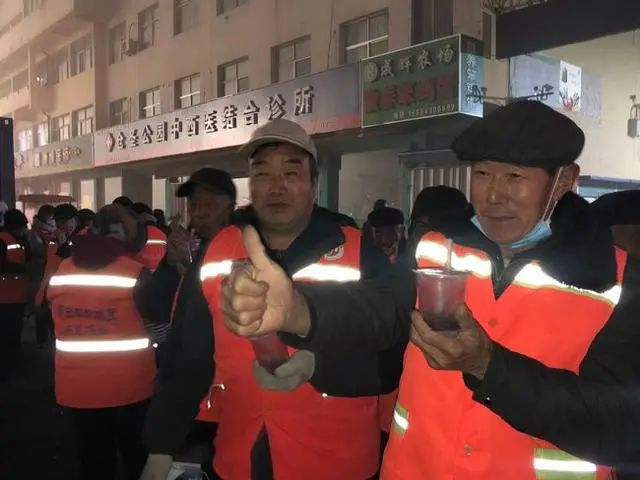 1月9日早上6時(shí)許,天色未亮,忙碌了一陣子的環(huán)衛(wèi)工人們就領(lǐng)到了濰坊壽光市志愿者們準(zhǔn)備的熱乎乎的臘八粥。