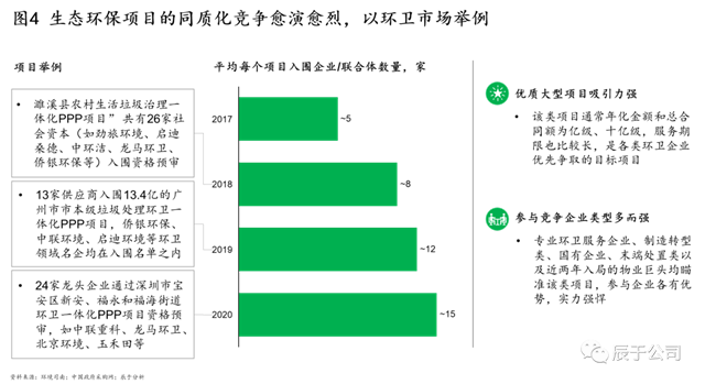 這樣帶來的直接后果就是同質化競爭愈演愈烈,價格戰(zhàn)時有發(fā)生,不僅影響企業(yè)的盈利水平,也對后期的運營帶來隱患。由于缺乏有門檻的技術壁壘,一些環(huán)保項目的招標活動動輒十幾家甚至數(shù)十家企業(yè)參加(見圖4),而針對一些技術難度大的項目,要么無人問津不敢接手,要么接手了之后最終陷于無計可施的尷尬境地。