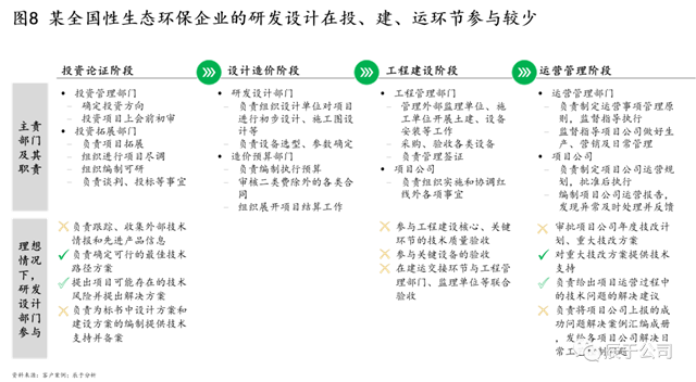 我們也發(fā)現(xiàn),很多生態(tài)環(huán)保企業(yè)的“投技建運”存在脫節(jié),“技”在“投、建、運”等環(huán)節(jié)的參與度不高,未給與充分的專業(yè)支持,不論是投資論證過程中的技術方案編制、還是工程建設階段的技術質量驗收、關鍵設備驗收以及工藝技術指導等,仍有相關工作要做(見圖8)。近年來隨著國內環(huán)保企業(yè)規(guī)模迅速擴張,這些問題似乎變得越來越嚴重。