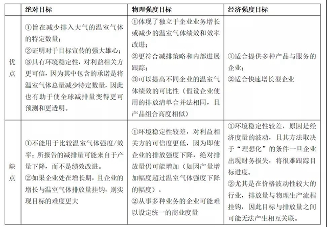 《指引》指出為實(shí)現(xiàn)凈零排放,企業(yè)必須根據(jù)絕對(duì)排放量設(shè)定目標(biāo)進(jìn)行溫室氣體排放量絕對(duì)減排,而對(duì)企業(yè)內(nèi)部采用物理強(qiáng)度或經(jīng)濟(jì)強(qiáng)度目標(biāo)。需要注意的是,絕對(duì)目標(biāo)無(wú)法比較同類企業(yè)的溫室氣體排放強(qiáng)度,且無(wú)法跟蹤效率改進(jìn)情況,因?yàn)槠髽I(yè)報(bào)告的減排量可能來(lái)自產(chǎn)量下降,而不是來(lái)自其績(jī)效的改進(jìn),如果企業(yè)處在增長(zhǎng)期,且企業(yè)的增長(zhǎng)與溫室氣體排放量掛鉤,則實(shí)現(xiàn)目標(biāo)的難度更大。強(qiáng)度目標(biāo)不一定會(huì)減少絕對(duì)排放量,因?yàn)榧词蛊髽I(yè)的單位排放效率高,企業(yè)經(jīng)營(yíng)產(chǎn)量增加可能導(dǎo)致絕對(duì)排放量增加。