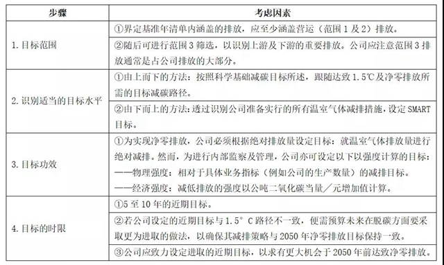 為了保證能實(shí)現(xiàn)其凈零排放目標(biāo),企業(yè)可基于自身目前的減排潛力設(shè)定一個(gè)減排“小目標(biāo)”——SMART目標(biāo),以確保企業(yè)能逐步過(guò)渡到科學(xué)基礎(chǔ)減排目標(biāo)。SMART目標(biāo)須是具體的(Specific)、可計(jì)量的(Measurable)、可行的(Attainable)、與業(yè)務(wù)相關(guān)的(Relevant)、具有時(shí)限性的(Time bound)。企業(yè)可采用較為容易實(shí)踐的措施,如選擇獲得綠色認(rèn)證的節(jié)能辦公室、將低碳準(zhǔn)則納入采購(gòu)規(guī)章等實(shí)現(xiàn)SMART目標(biāo)。在較易實(shí)踐的措施上取得成功后,將建立起公司管理層及員工科學(xué)降碳的信心,使其愿意采取深度脫碳行動(dòng)以實(shí)現(xiàn)科學(xué)基礎(chǔ)減碳目標(biāo)。企業(yè)制定減碳目標(biāo)的步驟可見下表。