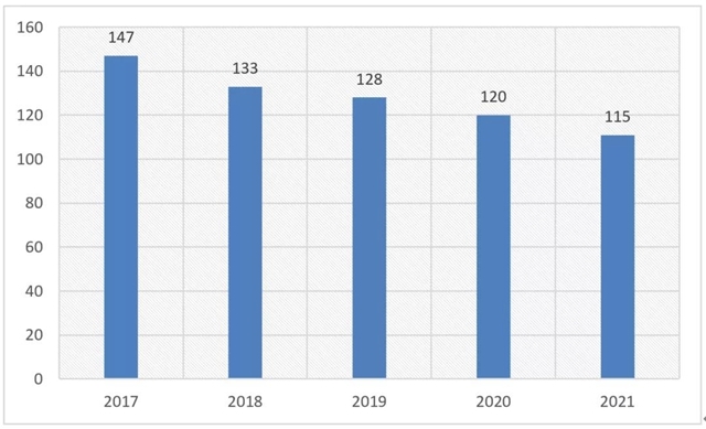 據(jù)不完全統(tǒng)計(jì), 2021年噪聲與振動(dòng)控制行業(yè)產(chǎn)值約為115億元, 與上年相比有所下降,各類污染防治產(chǎn)值情況見表1。近五年來(lái),噪聲與振動(dòng)控制領(lǐng)域的總產(chǎn)值情況如圖1所示。