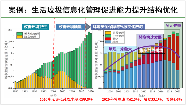 產生多少固廢都不清楚的情況下怎么計算減碳?劉建國表示,固廢治理首先需要借助新一代信息化技術把底數摸清楚。城市生活垃圾板塊就做了很好的示范,數據從過去的粗放狀態(tài)到近年越來越逼近真實,數據呈現也越來越清晰。2020年城市生活垃圾無害化處理率超過99.8%,其中焚燒占比62.3%,填埋33.1%,其他4.6%,城市生活垃圾處理方式從填埋一家獨大到焚燒快速發(fā)展再到現在多元并舉,管理水平的提升帶來了垃圾處理方式的進步,從最初環(huán)境衛(wèi)生問題的解決到環(huán)境質量問題的解決,再到現在環(huán)境安全問題和氣侯變化的應對,其中精細化管理和信息化管理發(fā)揮了很重要的作用。
