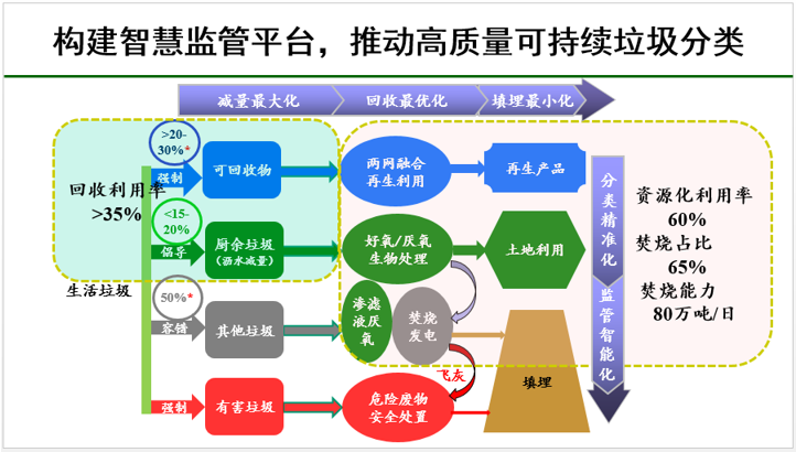 三是,構建智慧監(jiān)管平臺,推動高質量可持續(xù)垃圾分類。垃圾分類靠過去粗放管理方式不可能實現全覆蓋,必須要借助于信息化手段。要達成“十四五”規(guī)劃中提到的生活垃圾資源化利用率60%的目標,生活垃圾就要做到減量最大化、回收最優(yōu)化、填埋最小化,而這些依賴于分類精準化,說到底要靠監(jiān)管智能化來實現。