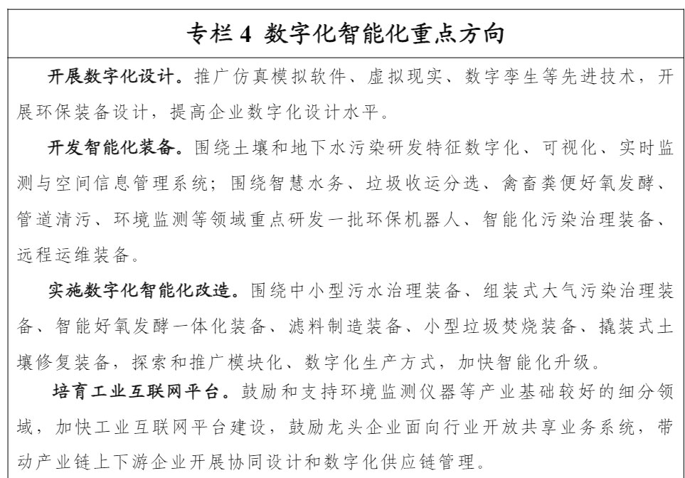 《行動(dòng)計(jì)劃》規(guī)定,要深入推進(jìn)5G、工業(yè)互聯(lián)網(wǎng)、大數(shù)據(jù)、人工智能等新一代信息技術(shù)在環(huán)保裝備設(shè)計(jì)制造、污染治理和環(huán)境監(jiān)測(cè)等過程中的應(yīng)用。環(huán)保行業(yè)的數(shù)字化,近年來也是一個(gè)熱點(diǎn)話題,未來值得企業(yè)更加關(guān)注。