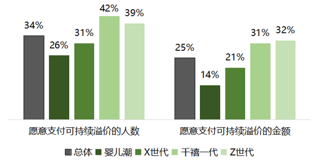 調(diào)查結(jié)果發(fā)現(xiàn),總體而言,34%的消費(fèi)者愿意為可持續(xù)產(chǎn)品支付溢價(jià),平均愿意支付的溢價(jià)比例為25%。同時(shí),各年齡段存在支付意愿的顯著差異,年輕人支付意愿相對(duì)更高。“嬰兒潮一代”僅26%愿意支付14%的溢價(jià),“X世代”則有31%愿意支付21%的溢價(jià),“千禧一代”與“Z世代”則有近40%愿意支付約三分之一的溢價(jià)。