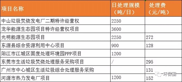 相對(duì)于其他省日處理規(guī)模小、處置費(fèi)低,廣東地區(qū)垃圾焚燒項(xiàng)目質(zhì)量非常出色,不僅頻頻出現(xiàn)千噸級(jí)別大項(xiàng)目,而且政府給予的垃圾處理費(fèi)也不低,都在百元以上。