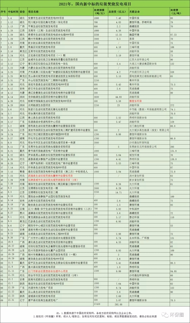 本文將從日處理規(guī)模、總投資、項(xiàng)目分布的省份、中標(biāo)企業(yè)等幾個(gè)角度,對(duì)2021年國(guó)內(nèi)新中標(biāo)的垃圾焚燒項(xiàng)目做出全面細(xì)致的梳理,并試著從具體項(xiàng)目及企業(yè)動(dòng)態(tài)中總結(jié)出行業(yè)的幾大變化趨勢(shì),僅供參考。