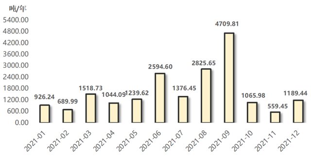 2021年,浙江省排污權(quán)成交量呈現(xiàn)攀高回落態(tài)勢(shì),累計(jì)成交額達(dá)19740.09噸,較去年上升71.48%。由圖可知,9月成交量達(dá)到全年最高,為4709.81噸,11月成交量則是全年最低,為559.45噸。