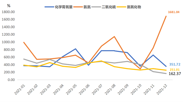 2021年12月,四項(xiàng)排污權(quán)指標(biāo):化學(xué)需氧量收?qǐng)?bào)于351.72點(diǎn)(對(duì)應(yīng)價(jià)格14068.84元/噸·年)、氨氮收?qǐng)?bào)于1681.04點(diǎn)(對(duì)應(yīng)價(jià)格67241.46元/噸·年)、二氧化硫收?qǐng)?bào)于162.37點(diǎn)(對(duì)應(yīng)價(jià)格1623.66元/噸·年)、氮氧化物收?qǐng)?bào)于251.01點(diǎn)(對(duì)應(yīng)價(jià)格2510.05元/噸·年)。