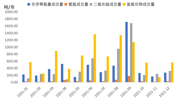 四項(xiàng)排污權(quán)成交量:化學(xué)需氧量全年成交量為5125.35 噸,9月達(dá)最高點(diǎn)1716.45噸,5月達(dá)最低點(diǎn)148.71噸;氨氮全年成交量為562.26噸,9月達(dá)最高點(diǎn)177.58噸,2月達(dá)最低點(diǎn)12.50噸;二氧化硫全年成交量為5367.35噸,9月達(dá)最高點(diǎn)1679.87噸,4月達(dá)最低點(diǎn)82.83噸;氮氧化物全年成交量為8685.07噸,6月達(dá)最高點(diǎn)1363.37噸,11月達(dá)最低點(diǎn)141.39噸。指標(biāo)走勢(shì)顯示,2021年化學(xué)需氧量、氨氮、二氧化硫成交量走勢(shì)相近,8-9月是成交量大幅躍升的重要時(shí)點(diǎn),9月收?qǐng)?bào)單月成交量新高;氮氧化物成交量無明顯峰值,6月成交量震蕩攀升新高后,逐月緩慢下行。