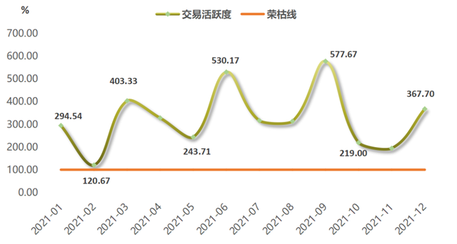 2021年,浙江省排污權(quán)交易市場活躍度全面向好,全年活躍度指數(shù)高于榮枯線。全年活躍度最高點(diǎn)位于9月的577.67點(diǎn),最低點(diǎn)位于2月的120.67點(diǎn)。運(yùn)行來看,2021年交易活躍度指數(shù)呈周期性波動(dòng),每季度末活躍度走勢(shì)顯著向好,年末指數(shù)收?qǐng)?bào)于367.70點(diǎn)。